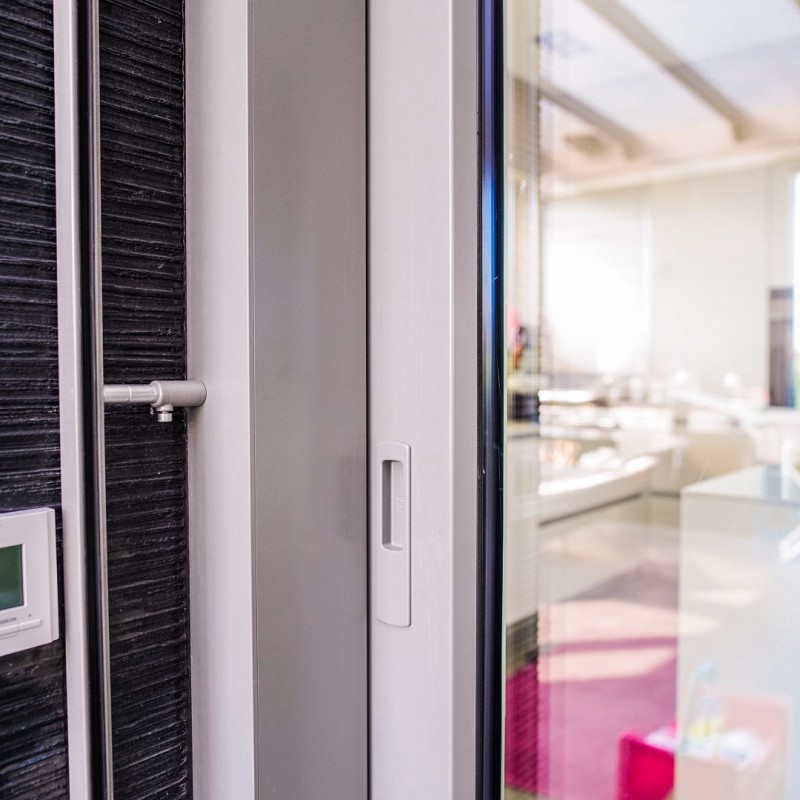 Un ulteriore vantaggio è il risparmio di spazio interno quando la porta è aperta. Grazie all’apertura parallela (scorrevole) del battente rispetto all’elemento fisso, il battente non “ruba” spazio riducendolo. Così gli elementi di arredo possono essere posizionati molto vicino alla porta e non è necessario spostarli quando questa viene aperta.